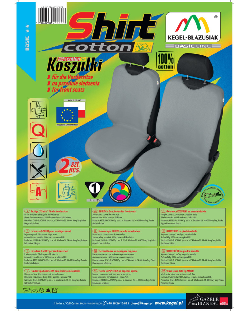 Pokrowce koszulki COTTON (teraz SHIRT COTTON- ulepszona wersja produkowanych od ponad 17 lat pokrowców koszulek) zostały wykonane z wysokogatunkowego naturalnego materiału (bawełna 100%), co w połączeniu ze starannością wykończenia nawet najdrobniejszych detali, zadowoli najbardziej wymagających klientów. Dzięki odpowiedniej budowie i nowatorskiej konstrukcji, pokrowce są dobrze dopasowane do foteli i dobrzae przylegają do nich, a podlaminowanie po wewnętrznej stronie całego materiału pianką PUR, zapobiega ich przesuwaniu. SHIRT COTTON są większe o ponad 20% od ich poprzedniej wersji, przez co znacznie lepiej pasują na fotele obecnie produkowanych samochodów. Jest to spowodowane tym, że fotele samochodów nowszych są większe od foteli samochodów sprzed 15 lat. Nową cechą pokrowców koszulek jest to, że zakrywają całą użytkową część fotela, przez co lepiej chronią fotel przed uszkodzeniami i zabrudzeniami. Nie zakrywają natomiast boków fotela, przez co mogą być bezpiecznie użytkowane na fotelach z Air Bag. Pokrowce koszulki ochronią i jednocześnie, w sposób bardzo zauważalny, odmienią fotele samochodowe, nadając autu niepowtarzalny charakter.