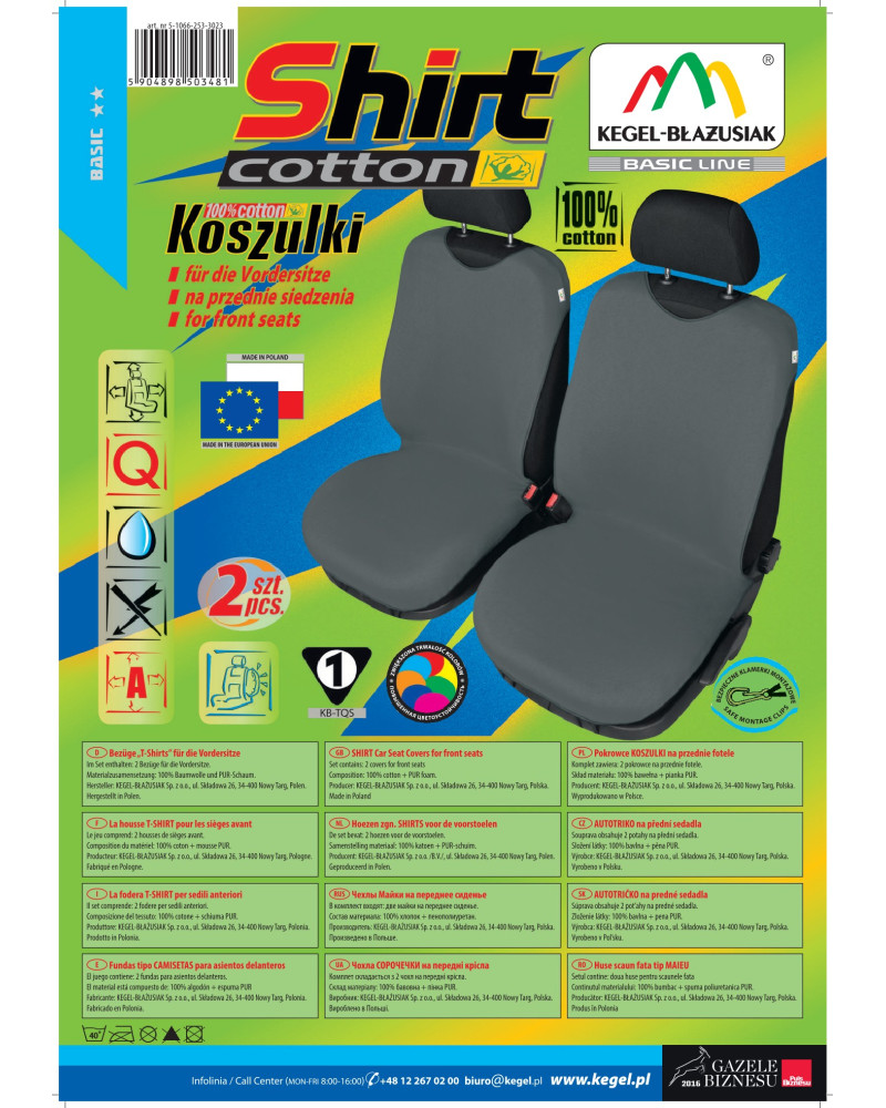 Pokrowce koszulki COTTON (teraz SHIRT COTTON- ulepszona wersja produkowanych od ponad 17 lat pokrowców koszulek) zostały wykonane z wysokogatunkowego naturalnego materiału (bawełna 100%), co w połączeniu ze starannością wykończenia nawet najdrobniejszych detali, zadowoli najbardziej wymagających klientów. Dzięki odpowiedniej budowie i nowatorskiej konstrukcji, pokrowce są dobrze dopasowane do foteli i dobrzae przylegają do nich, a podlaminowanie po wewnętrznej stronie całego materiału pianką PUR, zapobiega ich przesuwaniu. SHIRT COTTON są większe o ponad 20% od ich poprzedniej wersji, przez co znacznie lepiej pasują na fotele obecnie produkowanych samochodów. Jest to spowodowane tym, że fotele samochodów nowszych są większe od foteli samochodów sprzed 15 lat. Nową cechą pokrowców koszulek jest to, że zakrywają całą użytkową część fotela, przez co lepiej chronią fotel przed uszkodzeniami i zabrudzeniami. Nie zakrywają natomiast boków fotela, przez co mogą być bezpiecznie użytkowane na fotelach z Air Bag. Pokrowce koszulki ochronią i jednocześnie, w sposób bardzo zauważalny, odmienią fotele samochodowe, nadając autu niepowtarzalny charakter.