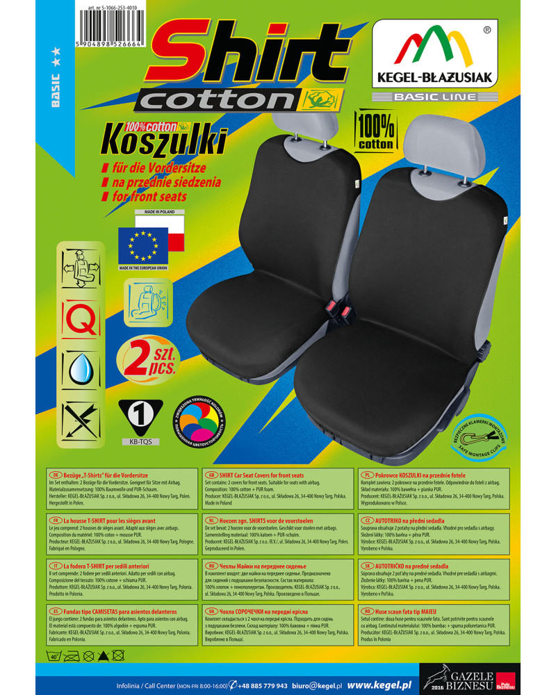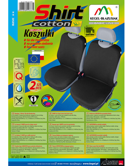 Pokrowce koszulki COTTON (teraz SHIRT COTTON- ulepszona wersja produkowanych od ponad 17 lat pokrowców koszulek) zostały wykonane z wysokogatunkowego naturalnego materiału (bawełna 100%), co w połączeniu ze starannością wykończenia nawet najdrobniejszych detali, zadowoli najbardziej wymagających klientów. Dzięki odpowiedniej budowie i nowatorskiej konstrukcji, pokrowce są dobrze dopasowane do foteli i dobrzae przylegają do nich, a podlaminowanie po wewnętrznej stronie całego materiału pianką PUR, zapobiega ich przesuwaniu. SHIRT COTTON są większe o ponad 20% od ich poprzedniej wersji, przez co znacznie lepiej pasują na fotele obecnie produkowanych samochodów. Jest to spowodowane tym, że fotele samochodów nowszych są większe od foteli samochodów sprzed 15 lat. Nową cechą pokrowców koszulek jest to, że zakrywają całą użytkową część fotela, przez co lepiej chronią fotel przed uszkodzeniami i zabrudzeniami. Nie zakrywają natomiast boków fotela, przez co mogą być bezpiecznie użytkowane na fotelach z Air Bag. Pokrowce koszulki ochronią i jednocześnie, w sposób bardzo zauważalny, odmienią fotele samochodowe, nadając autu niepowtarzalny charakter.