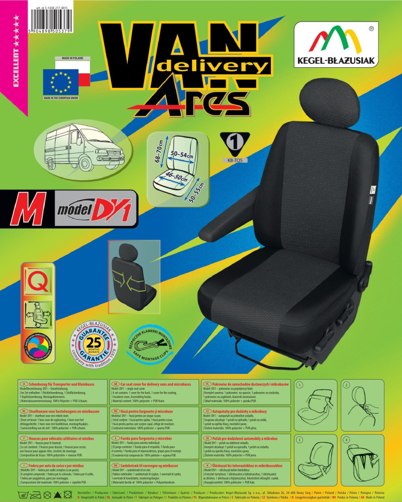 Pokrowce dopasowane ARES zostały zaprojektowane z myślą o właścicielach samochodów dostawczych i mikrobusów, chcących zadbać o wnętrza swoich pojazdów- dodać im klasy i elegancji oraz ochronić tapicerkę przed wszelkiego rodzaju zabrudzeniami i uszkodzeniami. Dzięki odpowiedniej budowie, materiał dobrze dopasowuje się do siedzenia, a podlaminowanie po wewnętrznej stronie trudno-palną pianką PUR, zapobiega przesuwaniu pokrowca. Pokrowce ARES spełniają najwyższe normy wytrzymałościowe. Solidność wykonania oraz gwarancję bezpieczeństwa potwierdzają badania PIMOT. Przy produkcji pokrowców została zastosowana technologia bezpiecznego szwu, rozrywającego się podczas wybuchu bocznych poduszek powietrznych. Profesjonalne wykonanie z materiałów wysokiej jakości gwarantuje długi czas użytkowania. Oferowane pokrowce z pewnością zaspokoją oczekiwania nawet najbardziej wymagających klientów. Udzielana na 25-miesięcy gwarancja da Ci pewność, że kupujesz produkt najwyższej jakości.