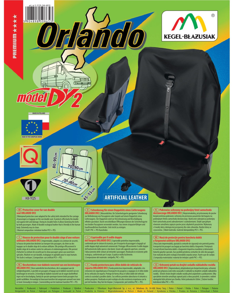 Pokrowiec ORLANDO jest bardzo uniwersalny i pasuje prawie na każdą podwójną kanapę samochodu dostawczego – dla pewności dopasowania przy sprzedaży wysyłkowej przesyłamy w załączeniu rysunek z wymiarami podwójnych kanap na które pasuje pokrowiec. Pokrowiec dzięki uniwersalnej kolorystyce pasuje do wnętrza każdego samochodu i jest niezwykle praktyczny w użyciu. Duża powierzchnia materiału, czarny kolor oraz, co najważniejsze, specjalne właściwości materiału, zapewniają praktyczne użytkowanie przez długi czas. Produkt ekologiczny i ekonomiczny- wielokrotnego użytku, bardzo łatwy w czyszczeniu. Bardzo łatwy do założenia i ściągnięcia. Po złożeniu nie zajmuje dużo miejsca, dlatego też zawsze można wozić go ze sobą. Produkt firmy Kegel-Błażusiak która jest wiodącym producentem i eksporterem pokrowców i akcesoriów samochodowych oraz odzieży roboczej. Produkty tej firmy wyróżniają się w Polsce i Europie wysoką jakością zarówno wykonania, jak i użytych surowców oraz dużą funkcjonalnością oraz dbałością o szczegóły. Lata doświadczenia i coraz bardziej doskonały asortyment sprawiają, że pokrowce tejże marki można określić mianem najlepszych w Polsce.