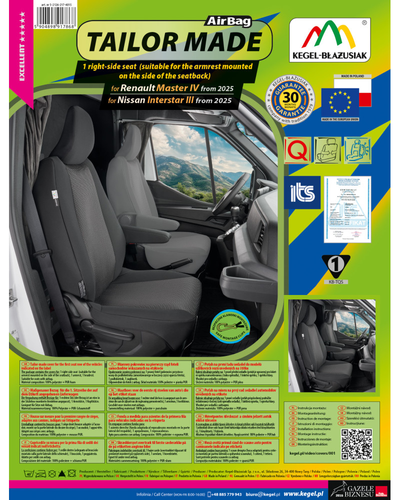 Pokrowce posiadają specjalne, bezpieczne szwy dla poduszek AirBag, dzięki czemu przystosowane są do samochodów zarówno z bocznymi poduszkami powietrznymi w fotelach, jak i do standardowych siedzeń. Profesjonalne wykonanie oraz bezpieczeństwo użytkowania gwarantują certyfikat oraz badania przeprowadzone przez Instytut Transportu Samochodowego.