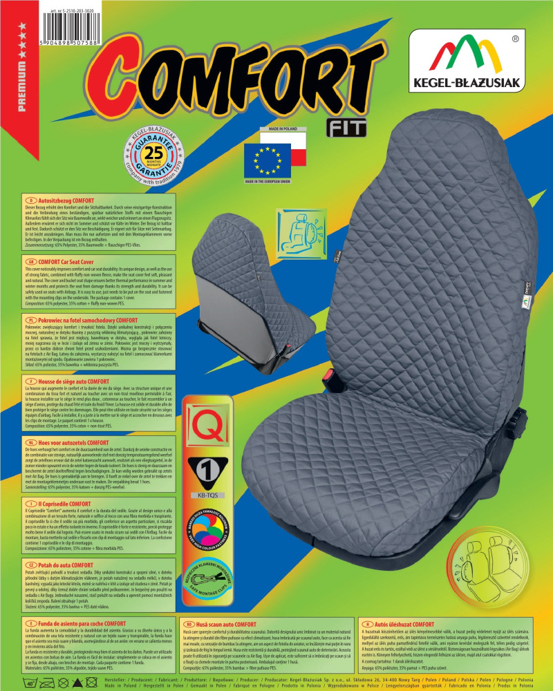 Pokrowiec charakteryzuje bezsprzecznie rewelacyjna prezencja. Przedstawia się we wnętrzu samochodu naprawdę okazale i zmienia całkowicie oblicze fotela nadając mu naprawdę luksusowego wyglądu. Fotel przypomina wizualnie fotel lotniczy co dodatkowo wzmacnia wrażenie atrakcyjności produktu. Pokrowiec jest gęsto pikowany w romby, co jest jego dodatkowym atutem. Wykonany w delikatnym, stonowanym popielatym kolorze zachwyca swoją estetyką i stylem. Tkanina farbowana jest barwnikami najwyższej jakości co gwarantuję wysoką trwałość na odbarwienia. Materiał niezwykle dobrze „utrzymuje” kolor, co znacznie zwiększa żywotność pokrowca. Pokrowiec COMFORT co prawda ma domieszkę poliestru jednak wygląda jak bawełna i w dotyku jest jak bawełna. Dodanie poliestru do konstrukcji splotu nadaje tkaninie większą trwałość i „blokuje” bawełnę, która zastosowana jako jedyny surowiec mogłaby powodować kurczenie się materiału po praniu i znacznie szybciej traciłaby włókna. Dzięki zastosowanej tkaninie spokojnie można prać pokrowiec w temperaturze 40°C. Produkt znanej i niezwykle cenionej w branży pokrowców samochodowych i odzieży roboczej firmy Kegel-Błażusiak. Produkowany w Polsce, głównie z polskich surowców z zachowaniem wszystkich standardów jakościowych Unii Europejskiej. Lata doświadczenia i coraz bardziej doskonały asortyment sprawiają, że pokrowce tejże marki można określić mianem najlepszych w Polsce.