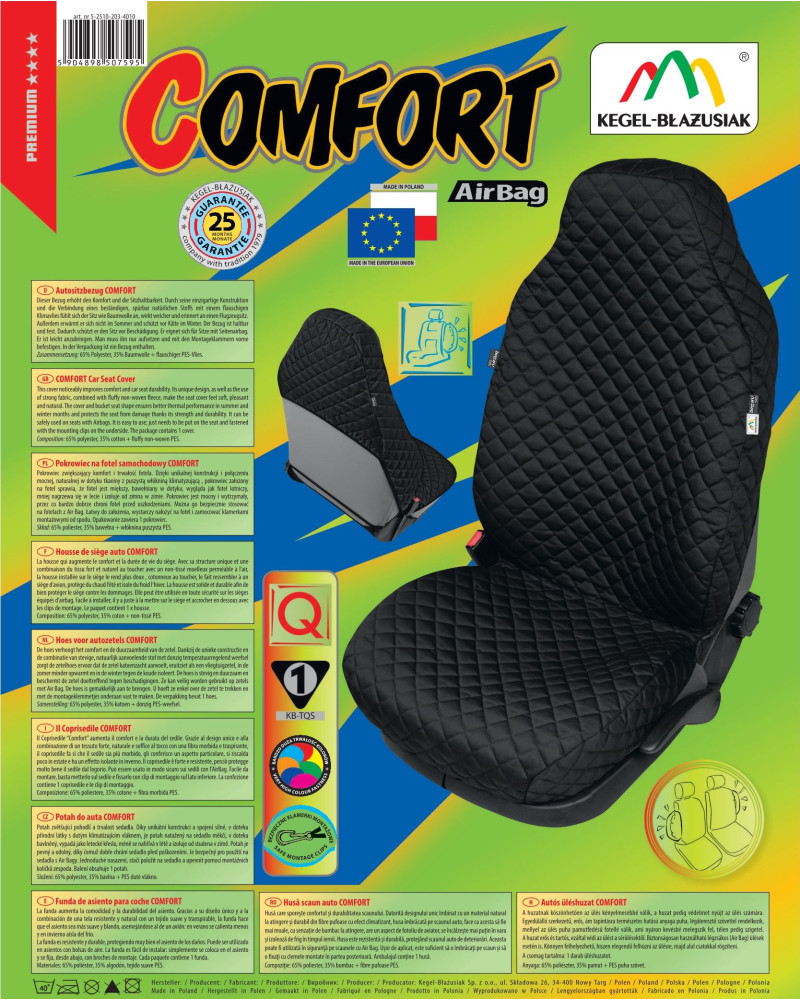 Pokrowiec charakteryzuje bezsprzecznie rewelacyjna prezencja. Przedstawia się we wnętrzu samochodu naprawdę okazale i zmienia całkowicie oblicze fotela nadając mu naprawdę luksusowego wyglądu. Fotel przypomina wizualnie fotel lotniczy co dodatkowo wzmacnia wrażenie atrakcyjności produktu. Pokrowiec jest gęsto pikowany w romby, co jest jego dodatkowym atutem. Wykonany w delikatnym, stonowanym popielatym kolorze zachwyca swoją estetyką i stylem. Tkanina farbowana jest barwnikami najwyższej jakości co gwarantuję wysoką trwałość na odbarwienia. Materiał niezwykle dobrze „utrzymuje” kolor, co znacznie zwiększa żywotność pokrowca. Pokrowiec COMFORT co prawda ma domieszkę poliestru jednak wygląda jak bawełna i w dotyku jest jak bawełna. Dodanie poliestru do konstrukcji splotu nadaje tkaninie większą trwałość i „blokuje” bawełnę, która zastosowana jako jedyny surowiec mogłaby powodować kurczenie się materiału po praniu i znacznie szybciej traciłaby włókna. Dzięki zastosowanej tkaninie spokojnie można prać pokrowiec w temperaturze 40°C. Produkt znanej i niezwykle cenionej w branży pokrowców samochodowych i odzieży roboczej firmy Kegel-Błażusiak. Produkowany w Polsce, głównie z polskich surowców z zachowaniem wszystkich standardów jakościowych Unii Europejskiej. Lata doświadczenia i coraz bardziej doskonały asortyment sprawiają, że pokrowce tejże marki można określić mianem najlepszych w Polsce.