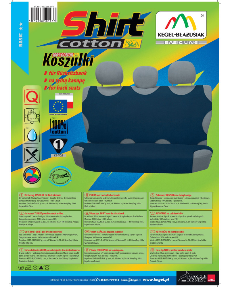 Pokrowce koszulki COTTON zostały wykonane z wysokogatunkowego naturalnego materiału (bawełna 100%), co w połączeniu ze starannością wykończenia nawet najdrobniejszych detali, zadowoli najbardziej wymagających klientów. Dzięki odpowiedniej budowie, pokrowce dobrze przylegają do siedzeń, a podlaminowanie po wewnętrznej stronie całego materiału pianką PUR, zapobiega ich przesuwaniu. Koszulki COTTON wykonane są w rozmiarze uniwersalnym i pasują prawie na każdą tylna kanapę samochodu. Bardzo łatwo zakłada się je i i szybko ściąga. Bardzo prosto też się je czyści. Pokrowce koszulki od lat cieszą się niezmiennym zainteresowaniem wśród klientów. Ochronią i jednocześnie, w sposób bardzo zauważalny, odmienią fotele samochodowe, nadając autu niepowtarzalny charakter.