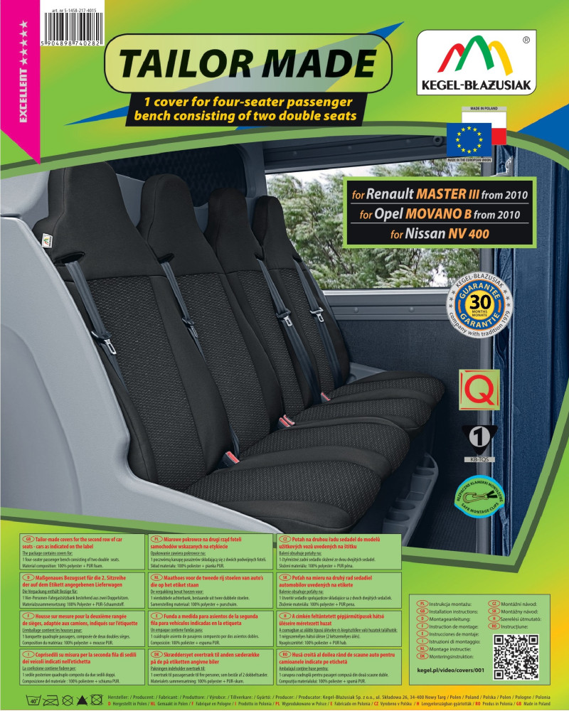 Pokrowce miarowe TAILOR MADE zostały wykonane z wysokogatunkowego materiału tapicerskiego (zarówno z przodu jak i z tyłu), co w połączeniu ze starannością wykończenia nawet najdrobniejszych detali, zadowoli najbardziej wymagających klientów. Dzięki odpowiedniej, przestrzennej budowie oraz konkretnemu dopasowaniu ich do Państwa samochodu, pokrowce świetnie dopasowują się do foteli. Materiał idealnie przylega do foteli, zastępując ich właściwą tapicerkę. Podlaminowanie po wewnętrznej stronie całego materiału trudnopalną pianką PUR, zapobiega ich przesuwaniu.