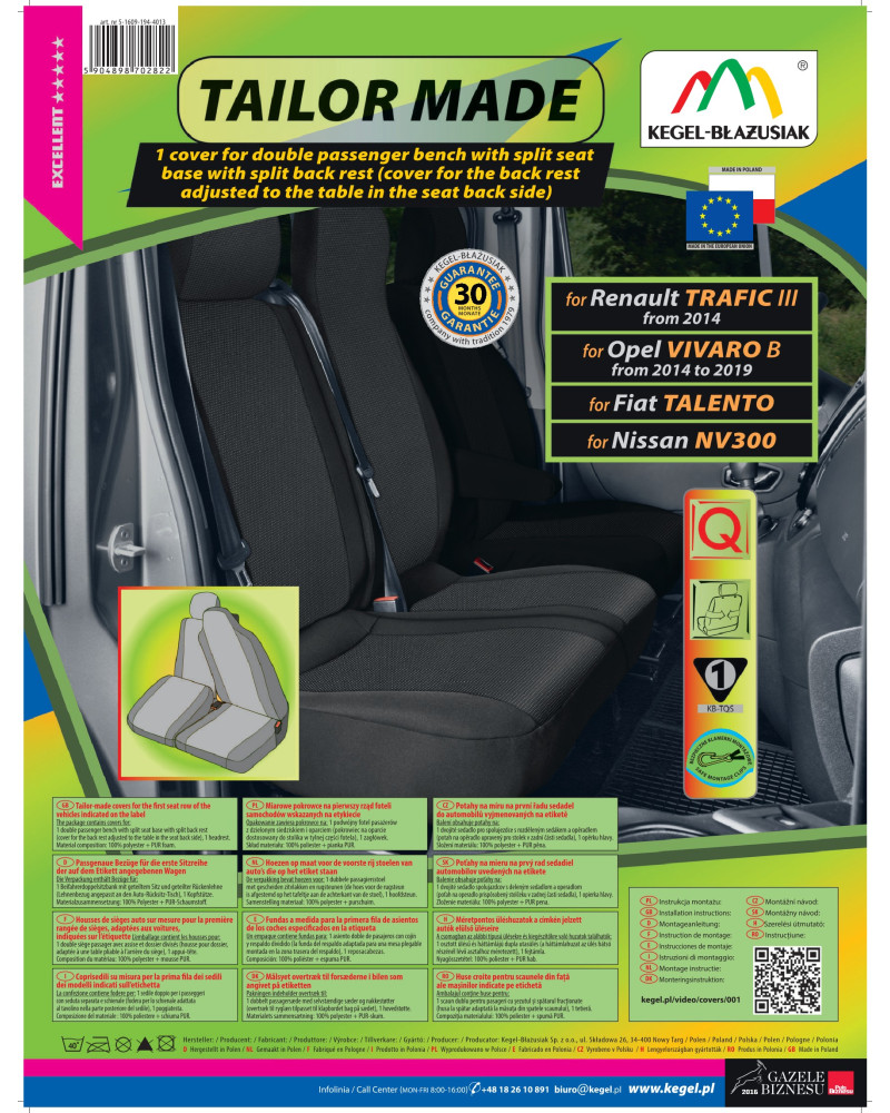 1 pokrowiec na podwójny fotel pasażerów z dzielonym siedziskiem i oparciem (pokrowiec na oparcie dostosowany do stolika w tylnej części fotela)
