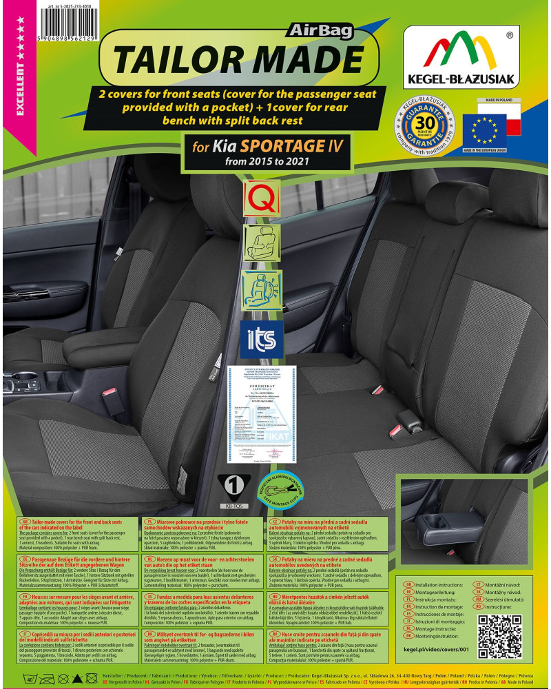 Pokrowce posiadają specjalne, bezpieczne szwy dla poduszek AirBag, dzięki czemu przystosowane są do samochodów zarówno z bocznymi poduszkami powietrznymi w fotelach, jak i do standardowych siedzeń. Profesjonalne wykonanie oraz bezpieczeństwo użytkowania gwarantują certyfikat oraz badania przeprowadzone przez Instytut Transportu Samochodowego.