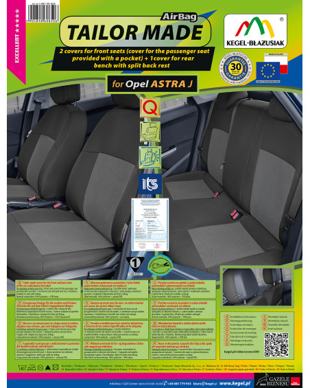 Pokrowce posiadają specjalne, bezpieczne szwy dla poduszek AirBag, dzięki czemu przystosowane są do samochodów zarówno z bocznymi poduszkami powietrznymi w fotelach, jak i do standardowych siedzeń. Profesjonalne wykonanie oraz bezpieczeństwo użytkowania gwarantują certyfikat oraz badania przeprowadzone przez Instytut Transportu Samochodowego.
