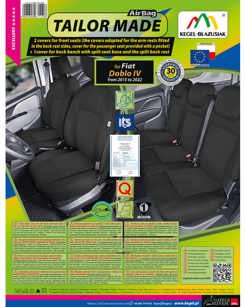 2 pokrowce na przednie fotele (pokrowce przystosowane do podłokietników zamontowanych w bocznych częściach oparcia, pokrowiec na fotel pasażera wyposażony w kieszeń)