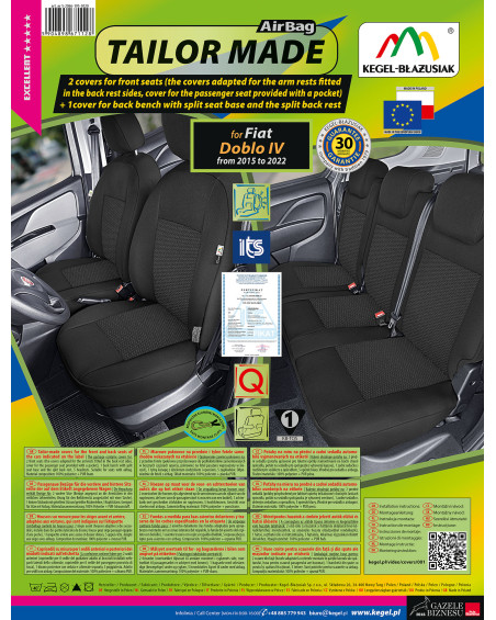 Pokrowce posiadają specjalne, bezpieczne szwy dla poduszek AirBag, dzięki czemu przystosowane są do samochodów zarówno z bocznymi poduszkami powietrznymi w fotelach, jak i do standardowych siedzeń. Profesjonalne wykonanie oraz bezpieczeństwo użytkowania gwarantują certyfikat oraz badania przeprowadzone przez Instytut Transportu Samochodowego