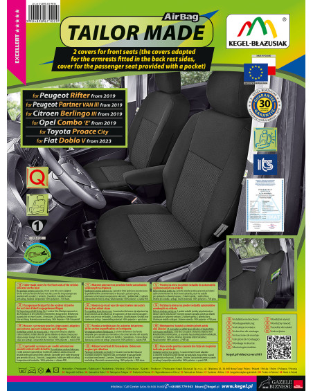 2 pokrowce na przednie fotele (pokrowce przystosowane do podłokietników zamontowanych w bocznych częściach oparcia, pokrowiec na fotel pasażera wyposażony w kieszeń)