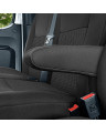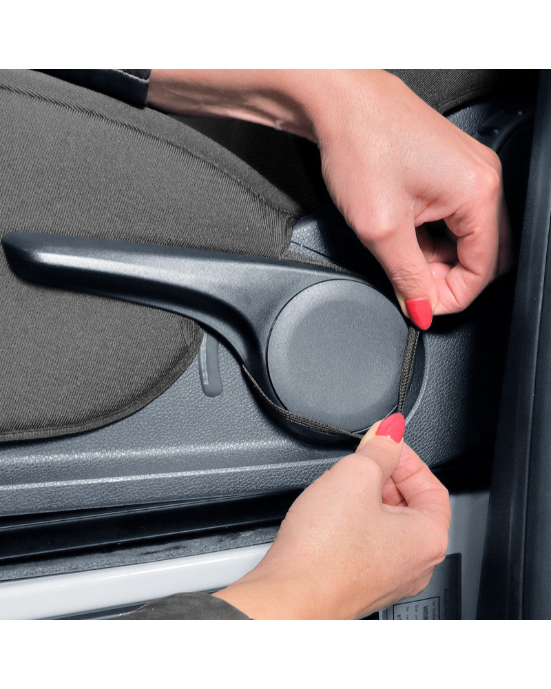 - Wyposażone w specjalne zapinane na rzepę rozcięcie, umożliwiające wyciągnięcie podłokietnika w pokrowcu na fotel dla kierowcy zarówno z prawej jak i lewej strony (wersja angielska)