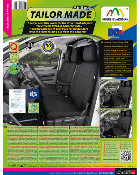 Pokrowce posiadają specjalne, bezpieczne szwy dla poduszek AirBag, dzięki czemu przystosowane są do samochodów zarówno z bocznymi poduszkami powietrznymi w fotelach, jak i do standardowych siedzeń. Profesjonalne wykonanie oraz bezpieczeństwo użytkowania gwarantują certyfikat oraz badania przeprowadzone przez Instytut Transportu Samochodowego.