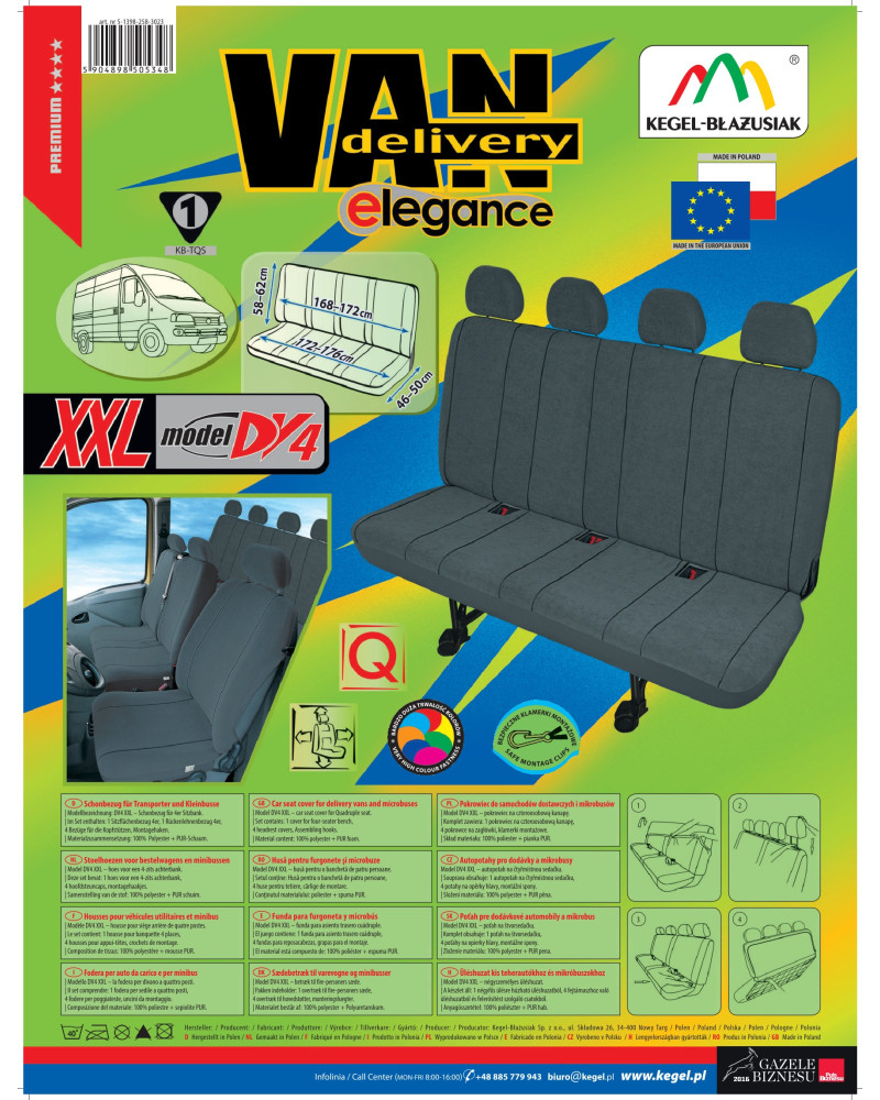 Pokrowce zostały uszyte na miarę do pewnego typu samochodów i wszechstronnie przetestowane. Wykonane z wysokogatunkowych materiałów najwyższej jakości. Materiał, z którego zostały wykonane pokrowce to swego rodzaju tkanina obiciowa, odporna na przecieranie i rozrywanie. Pokrowce zostały podlaminowane pianką samogasnącą. Pokrowce samochodowe ELEGANCE charakteryzuje estetyczne i staranne wykonanie oraz dokładne wykończenie. Dzięki nim oryginalna tapicerka samochodu zostanie przez dłuższy czas w dobrym stanie. Tkanina posiada bardzo dobrą trwałość kolorów. Pokrowce łatwo utrzymać w czystości, gdyż można je wyprać zgodnie z informacją na metce informacyjnej – w temperaturze 40°. Pokrowce bardzo łatwo można założyć na siedzenia. Komplet wyposażony jest w specjalne klamerki, a do materiału wszyte są mocowania, co przy pomocy dołączonej obrazkowej instrukcji obsługi zapewnia bardzo łatwy montaż.