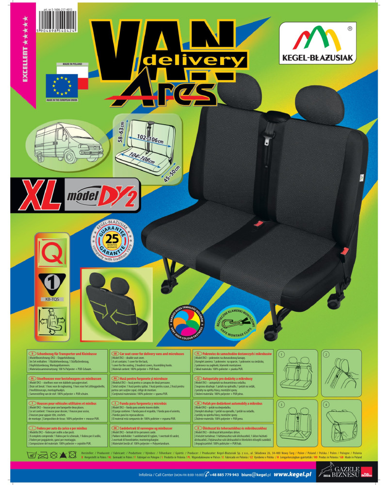 Pokrowce miarowe ARES zostały zaprojektowane z myślą o właścicielach konkretnych modeli samochodów dostawczych, chcących zadbać o wnętrza swoich pojazdów- dodać im klasy i elegancji oraz ochronić tapicerkę przed wszelkiego rodzaju zabrudzeniami i uszkodzeniami. Dzięki odpowiedniej budowie, materiał dobrze dopasowuje się do siedzenia, a podlaminowanie po wewnętrznej stronie pianką PUR, zapobiega przesuwaniu pokrowca. Pokrowce ARES spełniają najwyższe normy wytrzymałościowe. Profesjonalne wykonanie z materiałów wysokiej jakości gwarantuje długi czas użytkowania. Oferowane pokrowce z pewnością zaspokoją oczekiwania nawet najbardziej wymagających klientów. Udzielana na 25-miesięcy gwarancja da Ci pewność, że kupujesz produkt najwyższej jakości.