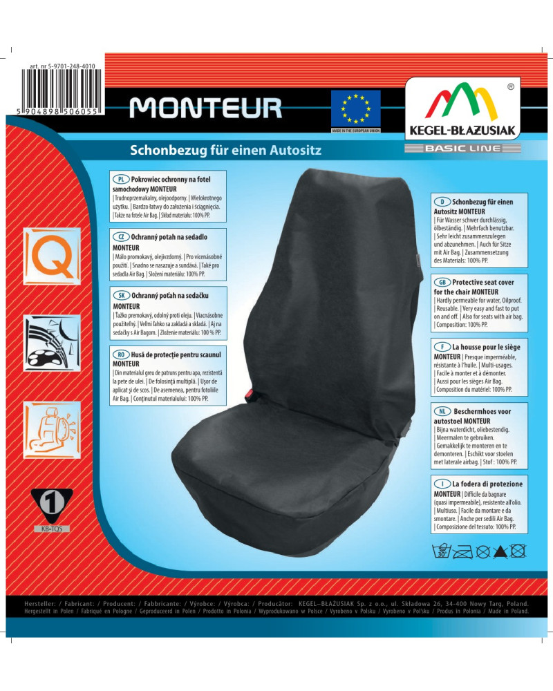Pokrowiec ochronny/serwisowy MONTEUR – wykonany z olejoodpornej i trudnoprzemakalnej włókniny zapewnia bardzo dobrą ochronę fotela. Produkt idealny do zastosowania w zakładach mechaniki samochodowej i zakładach serwisowych. Wykonany po to, by chronić tapicerkę fotela przed wszelkiego rodzaju zabrudzeniami i zapobiec jej zniszczeniu. Duża powierzchnia materiału pozwala zakryć cały fotel- siedzisko, oparcie, boki fotela i zagłówek. Pokrowiec przystosowany jest do foteli z bocznymi poduszkami powietrznymi AirBag. Wykonany w rozmiarze uniwersalnym, pasuje na wszystkie standardowe fotele samochodowe. Bardzo łatwo zakłada się go i ściąga, prosto składa i przewozi. Produkt tani a dobry!