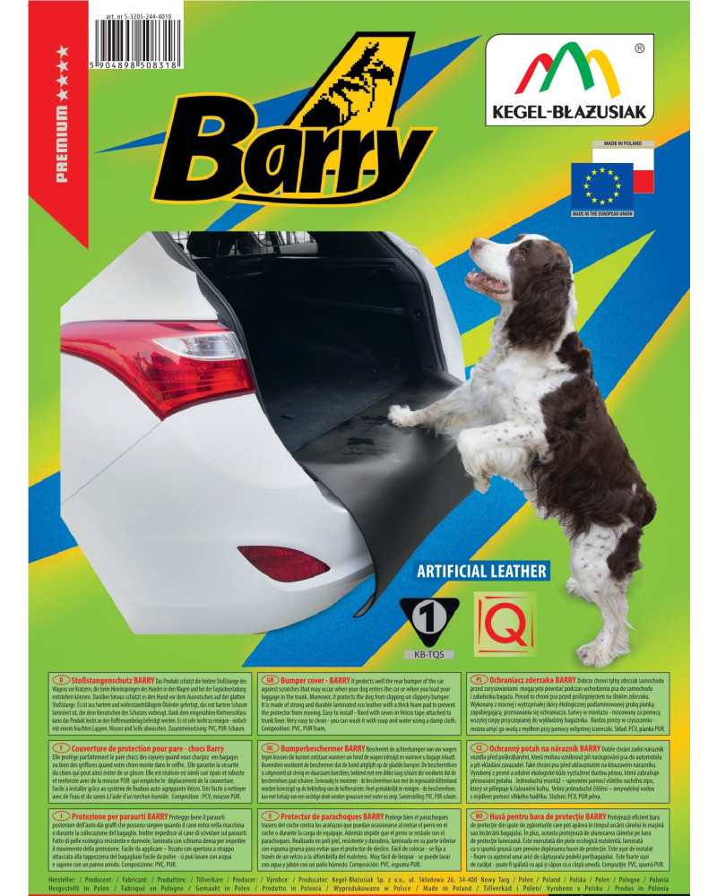 Pokrowiec samochodowy BARRY to nasz nowy produkt z serii produktów chroniących samochód podczas przewozu psa lub bagażu. Zrobiony z myślą o klientach, którzy chcą chronić zderzaki swoich samochodów przed zarysowaniem i uszkodzeniem podczas umieszczania psa w bagażniku lub załadunku bagażu. Większość samochodów ma lakierowane zderzaki, a te bardzo łatwo porysować. Pokrowiec zapewni właściwą ochronę tylnego zderzaka a także zapewni bezpieczeństwo pieskowi i uchroni go przed pośliźnięciem na zderzaku. Ochraniacz wykonany został z mocnej i wytrzymałej skóry ekologicznej, podlaminowanej grubą, 5 milimetrową pianką zapobiegającą przesuwaniu się ochraniacza. Produkt niezwykle łatwy w montażu - mocowany za pomocą wszytej rzepy przyczepianej do wykładziny bagażnika. Bardzo prosty w czyszczenu - należy myć go wodą z mydłem przy pomocy wilgotnej ścierki. Łatwy do złożenia i przechowywania.