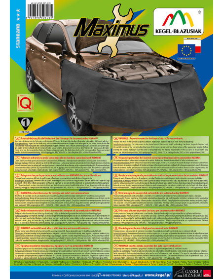 Pokrowiec został profesjonalnie wykonany i dobrze wykończony. Włóknina SPUNBOND, z której został uszyty pokrowiec odporna jest na różnego typu uszkodzenia. Od spodu tkanina jest miękka, a tym samym bezpieczna dla karoserii. W miejscu świateł zastosowana została gęsta siatka, która zapobiega uszkodzeniu szkieł reflektorów. Dzięki niej nie ma też potrzeby ściągania pokrowca aby sprawdzić np. prawidłowość podłączenia zdemontowanych elementów elektrycznych. Pokrowiec ochronny MAXIMUS wykonany jest w uniwersalnym, czarnym kolorze, dzięki czemu dobrze się prezentuje i jest niezwykle praktyczny w użyciu. Jest bardzo łatwy w czyszczeniu- wszelkie zabrudzenia można usunąć za pomocą wilgotnej ścierki z płynem. Pokrowiec jest łatwy i bezpieczny w montażu. Jak zostało już wcześniej wspomniane cała przednia część pokrowca podszyta jest materiałem antypoślizgowym. Boczne części mają natomiast specjalne „ języki” z materiału antypoślizgowego które można położyć na błotniki lub przełożyć je przez krawędź komory silnika. Dodatkowo dla pewniejszego trzymania pokrowiec ma gumki na końcach do zaczepienia o lusterka. Całość tworzy bardzo pewne mocowane, bez użycia jakichkolwiek metalowych elementów, przez co jest bardzo bezpieczny dla powłok lakierniczych. Pokrowiec praktycznie sam „przykleja się” do serwisowanego samochodu nie pozostawiając żadnych śladów po ścignięciu. Pokrowiec MAXIMUS to niezastąpiona pomoc w każdym zakładzie mechanicznym, w którym dba się o szybkość i schludność wykonywanej usługi.