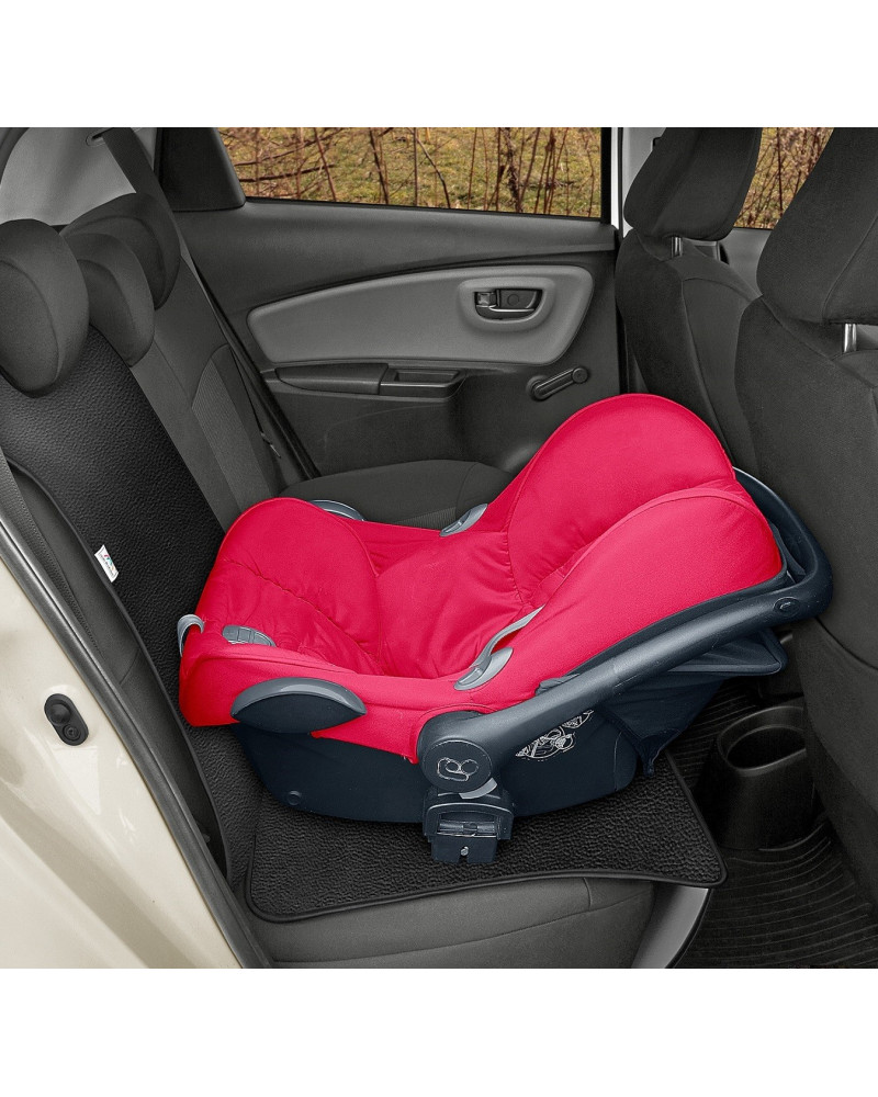 Ochronna mata pod fotelik samochodowy. Chroni siedzenie samochodowe pod fotelikiem przed uszkodzeniami i zabrudzeniami, które mogą być spowodowane przez fotelik samochodowy i przewożone dziecko. Mata jest wykonana z mocnego materiału żakardowego na grubej piance. Matę łatwo założyć – wystarczy podłożyć pod fotelik samochodowy. Możliwość stosowania pod foteliki z Isofix.