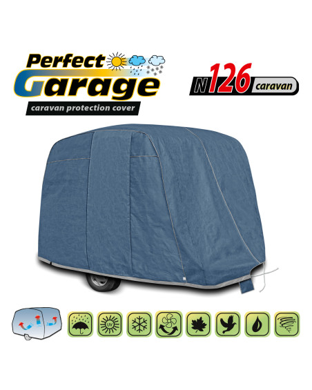 Produkt wielosezonowy do ochrony zaparkowanej przyczepy kempingowej przez cały rok. W sezonie zimowym zapobiega osadzaniu się śniegu, szronu i lodu, a także jest odporny na przymarzanie; na jesieni chroni przed deszczem, wiatrem, liśćmi, sokami z drzew; zaś w porach letnich i wiosennych ochrania przed promieniami UV , pyłem kwiatów i ptasimi odchodami. Pokrowiec zapewni Twojej przyczepie kempingowej niezwykłą ochronę przed złym działaniem czynników atmosferycznych. Przyczepa kempingowa będzie stała bezpieczna w czasie gdy nie będziesz jej użytkował. Gdy natomiast będziesz chciał jej użyć nie będziesz musiał odśnieżać jej – wystarczy że strzepniesz śnieg z pokrowca; nie będziesz musiał drapać, żeby zlikwidować osadzający się szron; zmniejszy się częstotliwość mycia gdyż dłużej pozostanie czysta; podczas upałów, w przyczepie pozostanie przyzwoita temperatura dlatego też bez obawy będziesz mógł od razu do niej wsiąść. Pokrowiec chroni przed wżerami, blaknięciem i matowieniem lakieru oraz elementów chromowanych, zabezpieczy ją przed większością zarysowań. Ograniczy korozję. Pokrowiec przystosowany jest zarówno do doraźnego jak i długotrwałego stosowania.