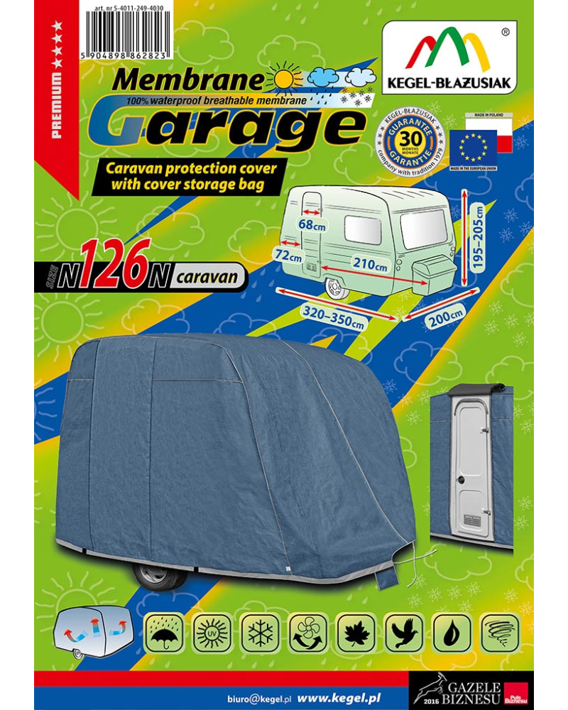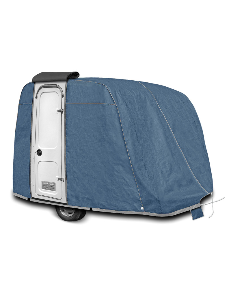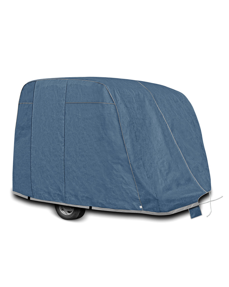Produkt wielosezonowy do ochrony zaparkowanej przyczepy kempingowej przez cały rok. W sezonie zimowym zapobiega osadzaniu się śniegu, szronu i lodu, a także jest odporny na przymarzanie; na jesieni chroni przed deszczem, wiatrem, liśćmi, sokami z drzew; zaś w porach letnich i wiosennych ochrania przed promieniami UV , pyłem kwiatów i ptasimi odchodami. Pokrowiec zapewni Twojej przyczepie kempingowej niezwykłą ochronę przed złym działaniem czynników atmosferycznych. Przyczepa kempingowa będzie stała bezpieczna w czasie gdy nie będziesz jej użytkował. Gdy natomiast będziesz chciał jej użyć nie będziesz musiał odśnieżać jej – wystarczy że strzepniesz śnieg z pokrowca; nie będziesz musiał drapać, żeby zlikwidować osadzający się szron; zmniejszy się częstotliwość mycia gdyż dłużej pozostanie czysta; podczas upałów, w przyczepie pozostanie przyzwoita temperatura dlatego też bez obawy będziesz mógł od razu do niej wsiąść. Pokrowiec chroni przed wżerami, blaknięciem i matowieniem lakieru oraz elementów chromowanych, zabezpieczy ją przed większością zarysowań. Ograniczy korozję. Pokrowiec przystosowany jest zarówno do doraźnego jak i długotrwałego stosowania.