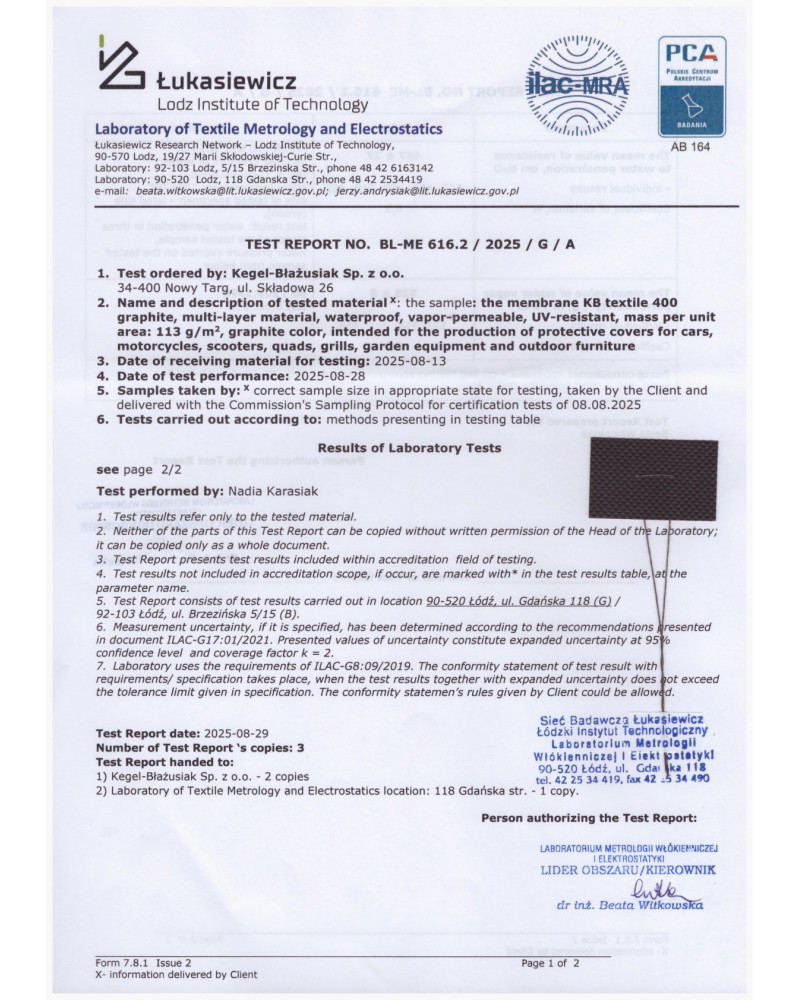 • nieprzemakalny nawet podczas intensywnego deszczu i jednocześnie paroprzepuszczalny, odprowadzający na zewnątrz wilgoć spod pokrowca